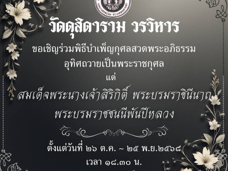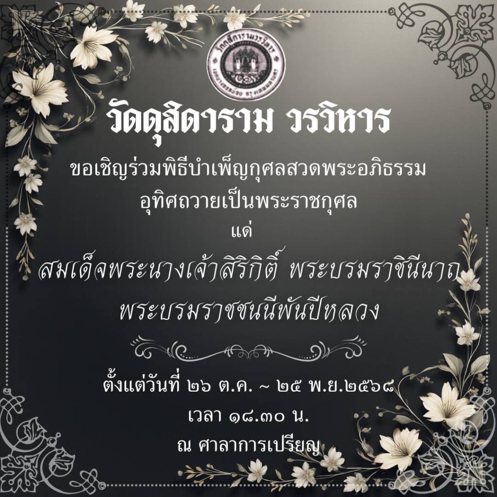 วัดดุสิดาราม วรวิหาร ขอเชิญร่วมพิธีบำเพ็ญกุศลสวดพระอภิธรรมอุทิศถวายเป็นพระราชกุศลแด่สมเด็จพระนางเจ้าสิริกิติ์ พระบรมราชินีนาถ พระบรมราชชนนีพันปีหลวง ตั้งแต่วันที่ ๒๖ ต.ค. ~ ๒๕ พ.ย. ๒๕๖๘ เวลา๑๘.๓๐ น. ณ ศาลาการเปรียญ #สถิตในดวงใจตราบนิรันดร์ #น้อมรําลึกในพระมหากรุณาธิคุณ #พระพันปีหลวง