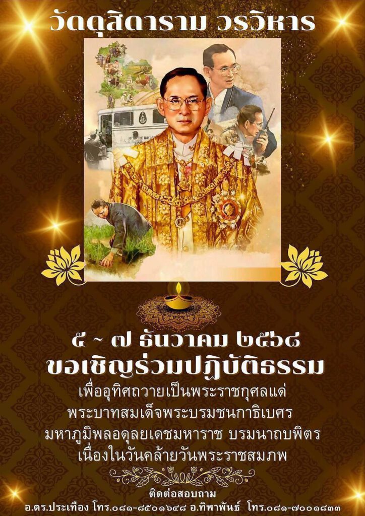 วัดดุสิดาราม วรวิหาร ขอเชิญร่วมปฏิบัติธรรมเพื่ออุทิศถวายเป็นพระราชกุศลแด่ พระบาทสมเด็จพระบรมชนกาธิเบศร มหาภูมิพลอดุลยเดชมหาราช บรมนาถบพิตร เนื่องในวันคล้ายวันพระราชสมภพ วันที่ ๕-๗ ธันวาคม พ.ศ. ๒๕๖๘