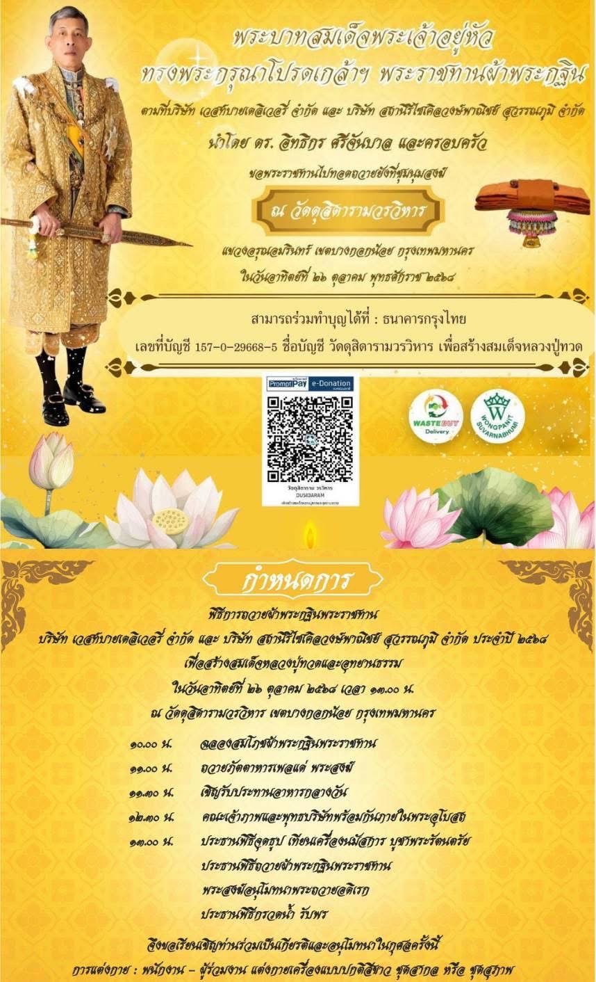 ขอเชิญร่วมปฏิบัติธรรมเนื่องในโอกาสวันเฉลิมพระชนมพรรษา สมเด็จพระนางเจ้าสุทิดา พัชรสุธาพิมลลักษณ พระบรมราชินี วันที่ ๓ มิถุนายน ๒๕๖๘ ณ วัดดุสิดารามวรวิหาร เชิงสะพานพระปิ่นเกล้า สนใจสอบถามตามโทรศัพท์ที่ให้ไว้ หรือโทร. ๐๒-๔๒๔-๖๑๖๘